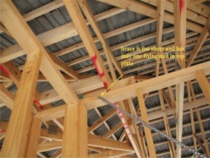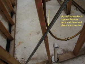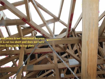 If you think that building inspectors won’t miss framing defects, you are wrong. Have a look at the wall bracing of this frame that has been passed by building inspector. By the way I also found defective brickwork articulation joints and defective contact between water service and metal wall brace. Building inspectors won’t care to find them.